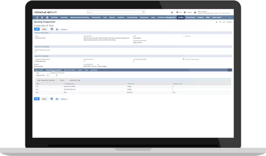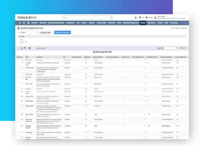 NetSuite provides a master list of predefined profiles that specify the type of inspection to be performed, acceptable limits, the minimum qualifications of the inspector and the category and method of inspection. This enables businesses to enforce standards on inspector credentials, capture measurements and compare data to pass/fail limits. Each inspection can be set up with multiple data elements that define the parameters of the inspection process.